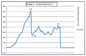 Graph 1 represents the data set for the pull apart test of lockout device 1. The screw crimp retained the steel cable until 705 lbs. of force was applied.