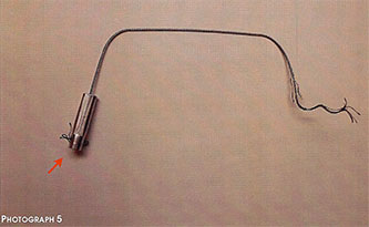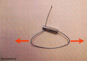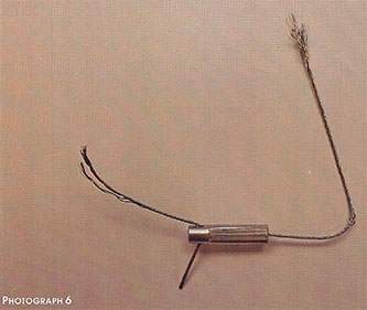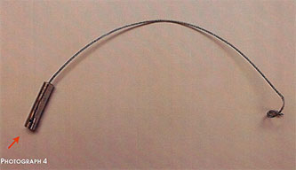Photograph 6 is a view depicting lockout device 9 after the pull apart test. The steel cable failed approximately 23,4inches (69.9 mm) from the screw crimp end.